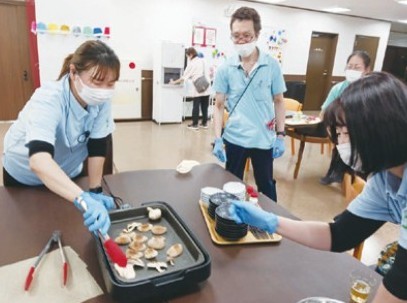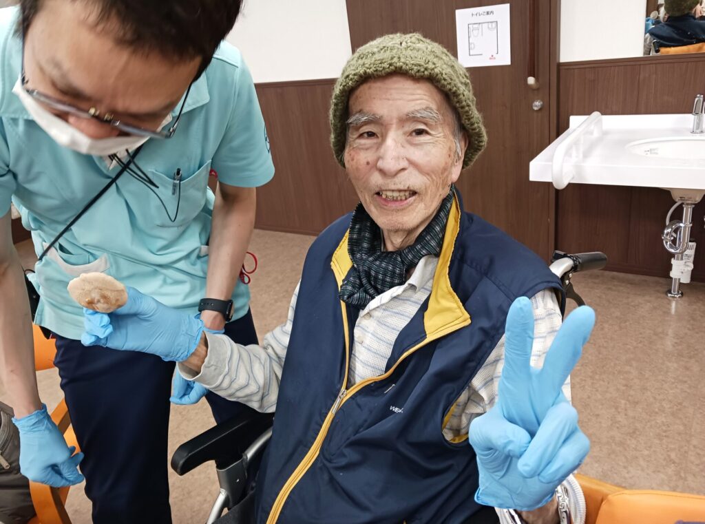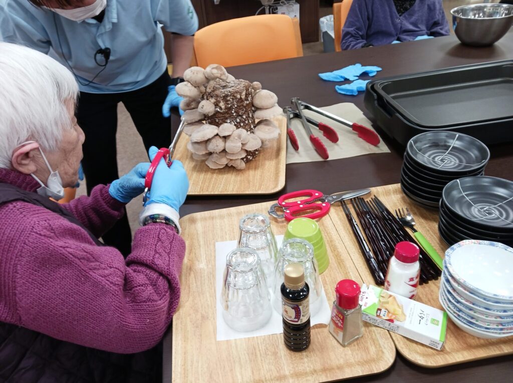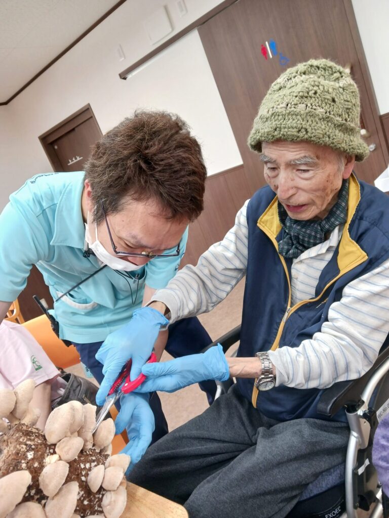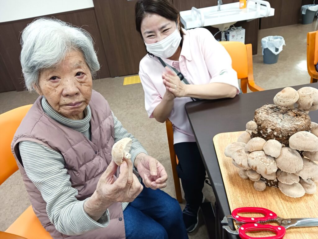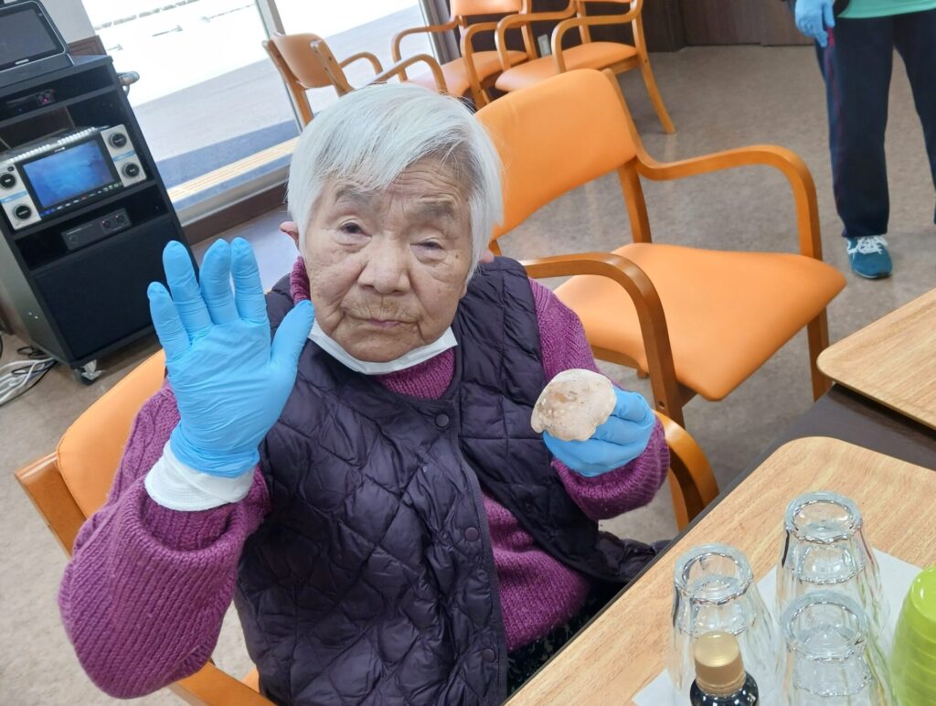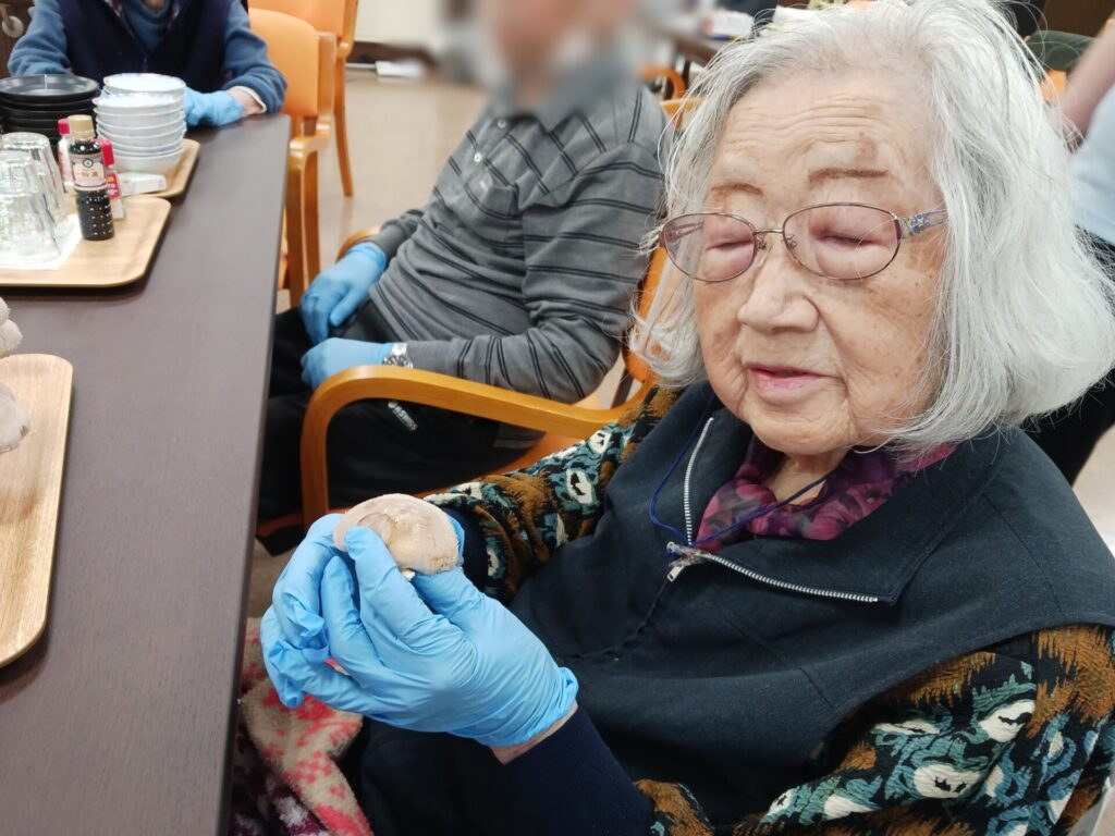 「昔は薄暗い山の中まで椎茸を取りに行ってたのよ。」とお話をされながら「きれいな椎茸やね。買うたら高いで!」と皆様たくさん召し上がり楽しいひと時を過ごしました✨