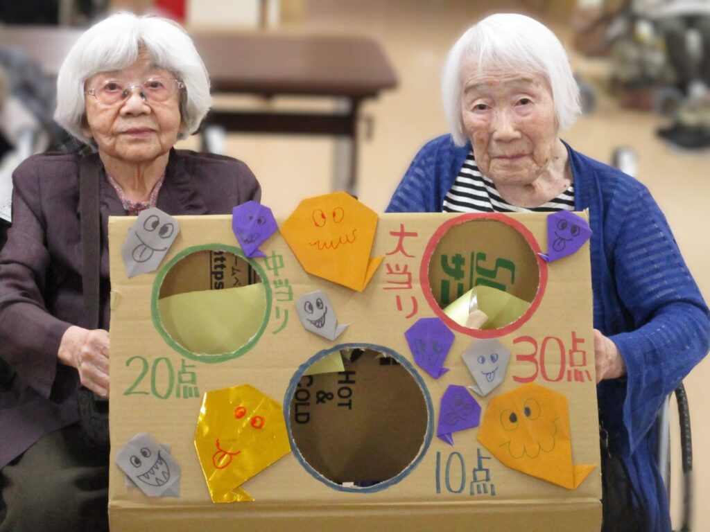 【ケアホーム藤井寺】 ハロウィンって何?何をしようか?と話しながらゲームを手作りしました☺点数を書いた穴にボールを入れて「30点!大当たり‼」 お化けの折り紙も可愛いですね💕 大阪府藤井寺市 有料老人ホーム ケアホーム藤