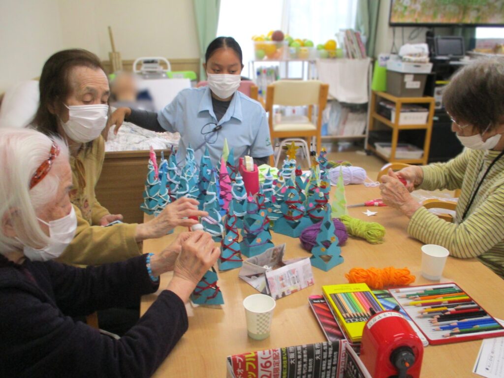 【ケアホーム寝屋川】 ふんわりとした毛糸のリースや、ミニクリスマスツリー🎄 留学生の皆さんと一緒に作りました✨ ミニツリーは「お部屋に飾るわ♡」と喜ばれました😊 寝屋川市 有料老人ホーム ケアホーム寝屋川 ハートケアグル